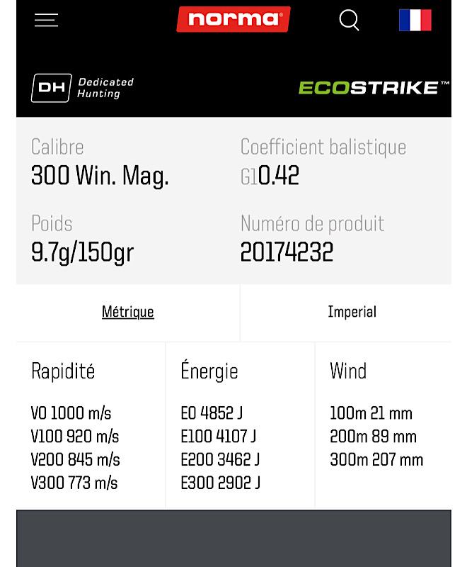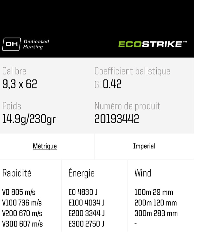 Je suis d'accord que pour une expansion correcte d'une balle monométallique comme la plupart de celle sur le marché actuel il faut mini 800 m/s à l'impact ce que l'on a pas en 8x57 JRS, 9.3x62 ou 9.3x74R même à 30 m. Regardes la Norma ecostrike en 9.3x62 que tu montres est à 805 m/s à V0 donc à 30 m elle sera en dessous de 800 m/s et donc peu d'expansion.