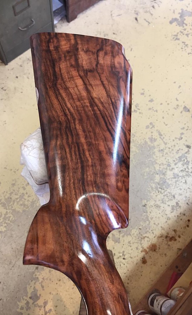 pour le vernis au tampon, je te déconseilles a te lancer, non sans avoir vu, et appris de la part d'un ébéniste qualifié. Etant moi même titulaire d'un CAP d'ébéniste, je peut te certifier qu'il faut un sacré coup de main! Mais question rendu, c'est le top des vernis, un miroir!! Je ne suis pas certain q'une crosse de fusil nécéssite ce genre de vernis,qui est long a mettre en appliquation, couteux, et demande beaucoup de logisique (bains marie,poudre ponce etc..) ainsi q'un grand savoir faire!